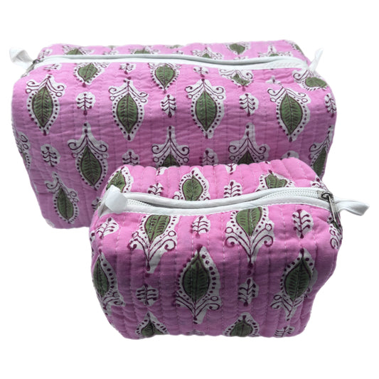 'Pink and Green Foliage' Block Printed Sponge Bag/Washbag