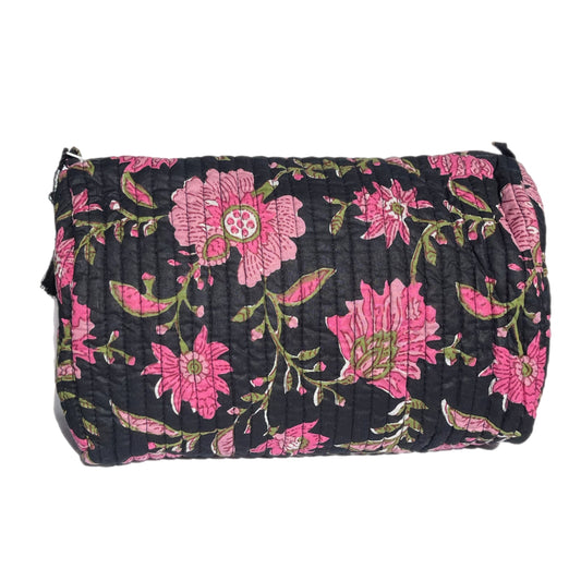 'Black and Pink Floral' Block Printed Sponge Bag/Washbag