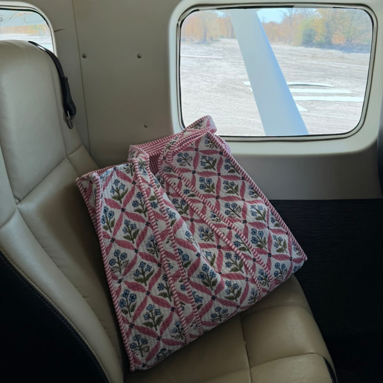 Shop our collection of Hand Block Printed, Velvet Tote bags and weekend bags. Great for on the go, food shopping or for long haul trips!