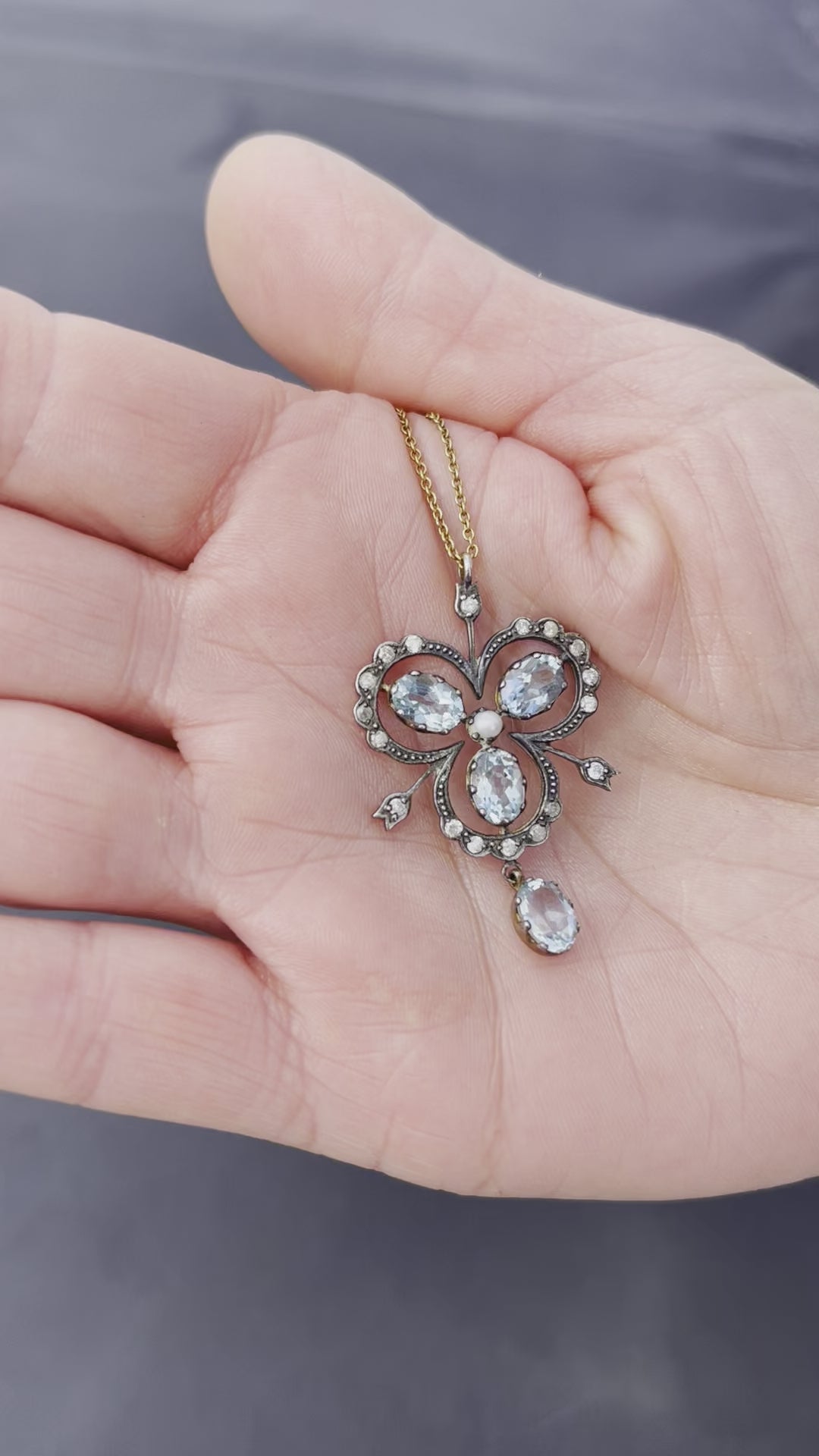 A timeless necklace that exudes elegance and sophistication. Crafted with stunning antique blue topaz and a central seed pearl, set in oxidised gold with mini old cut diamonds, this necklace is a luxurious statement piece.