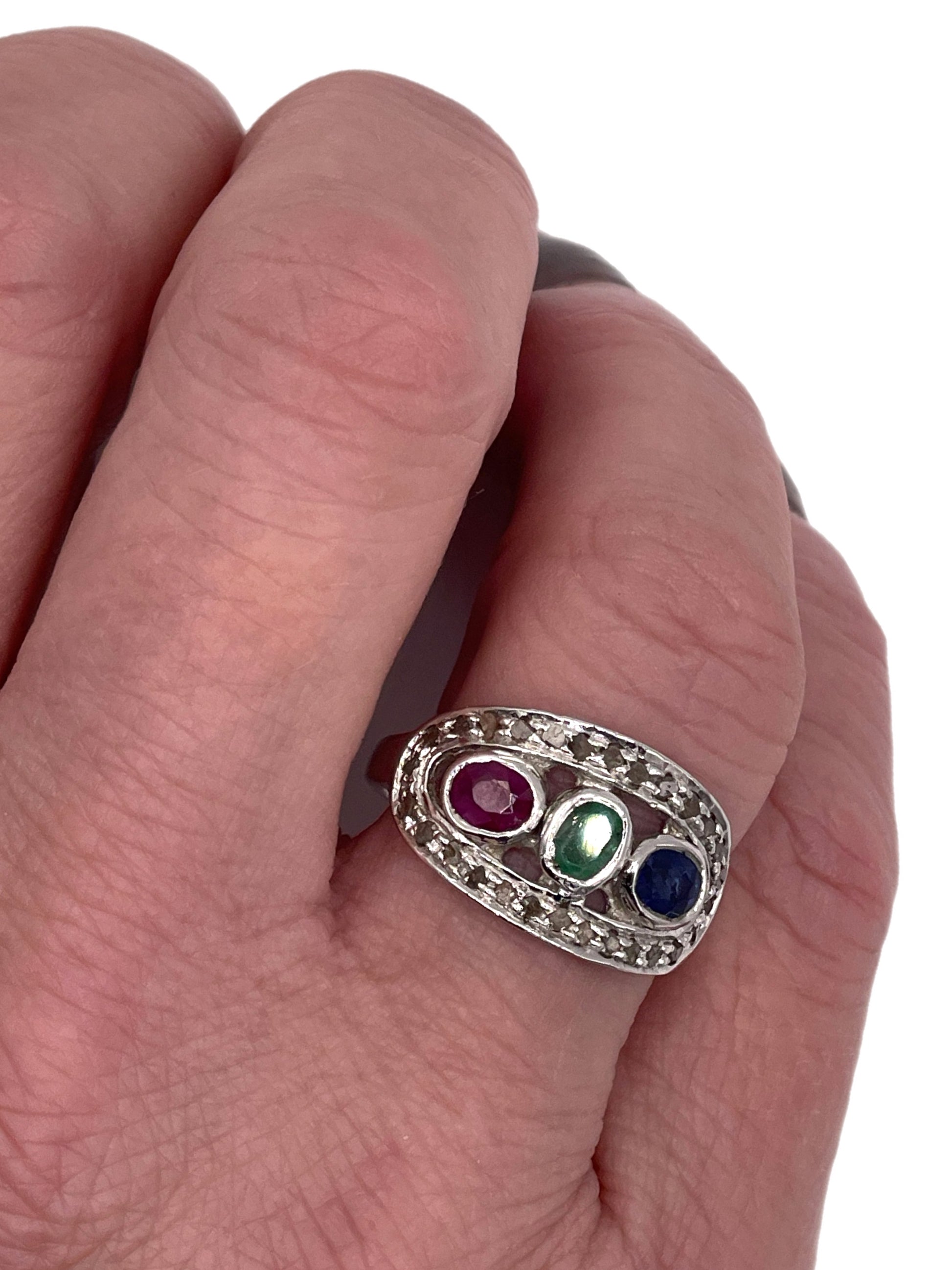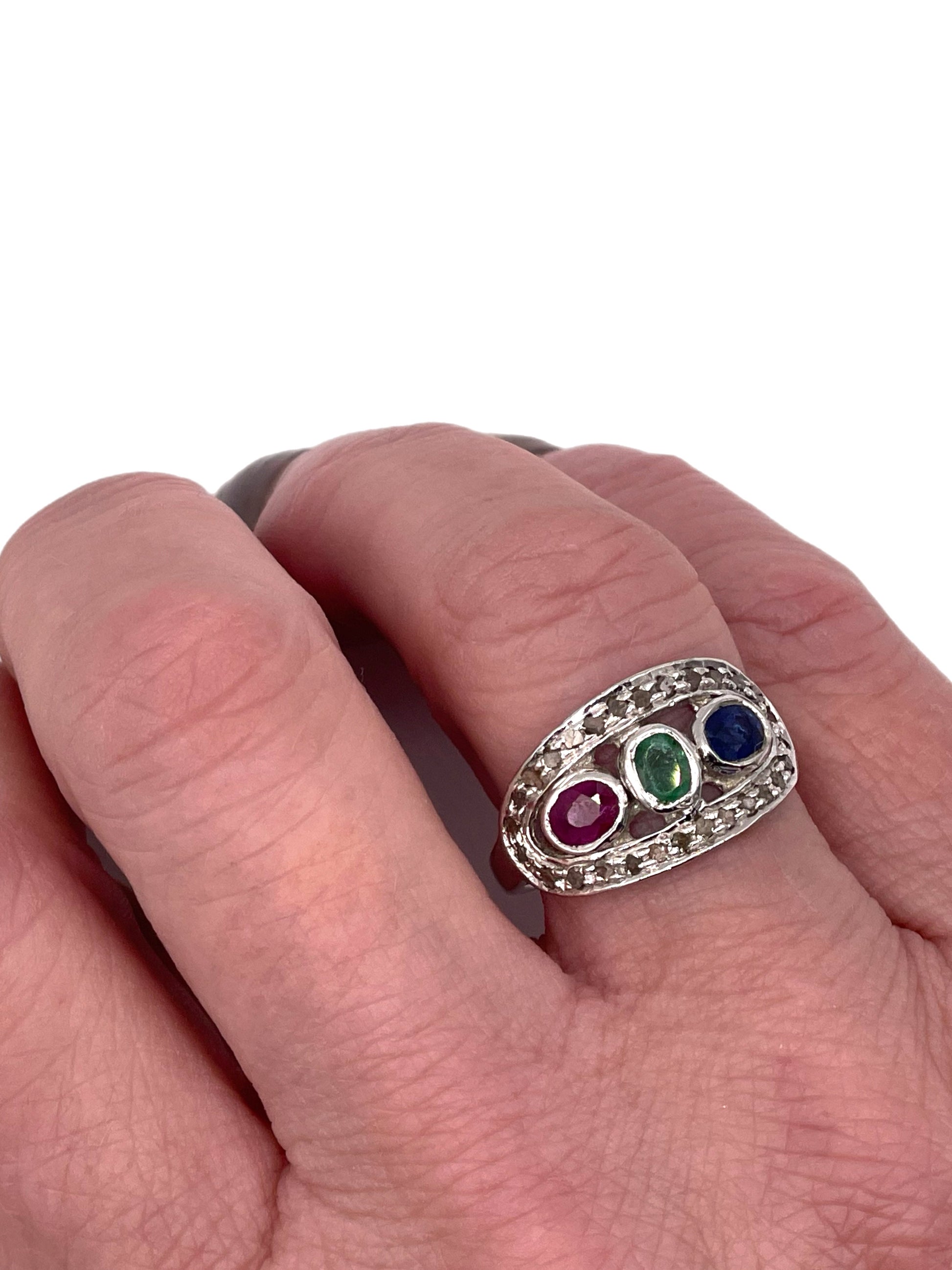 Hand crafted in India featuring a Natural Emerald, Sapphire and Ruby set in a row between Dusty Diamonds. Set in 925 Silver.