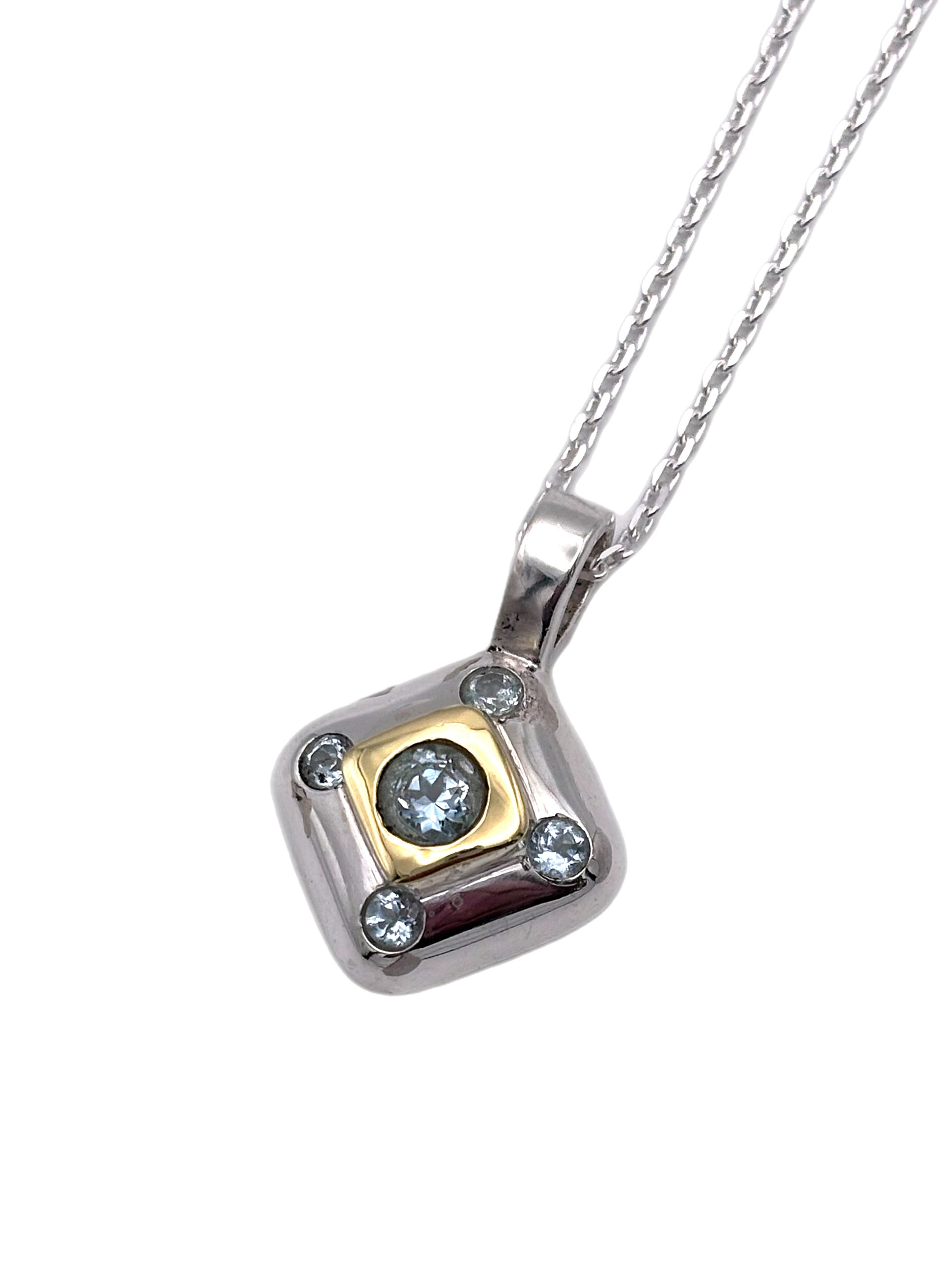 Featuring a larger brilliant cut stone encased in brass detailing and surrounded by 4 smaller stones.