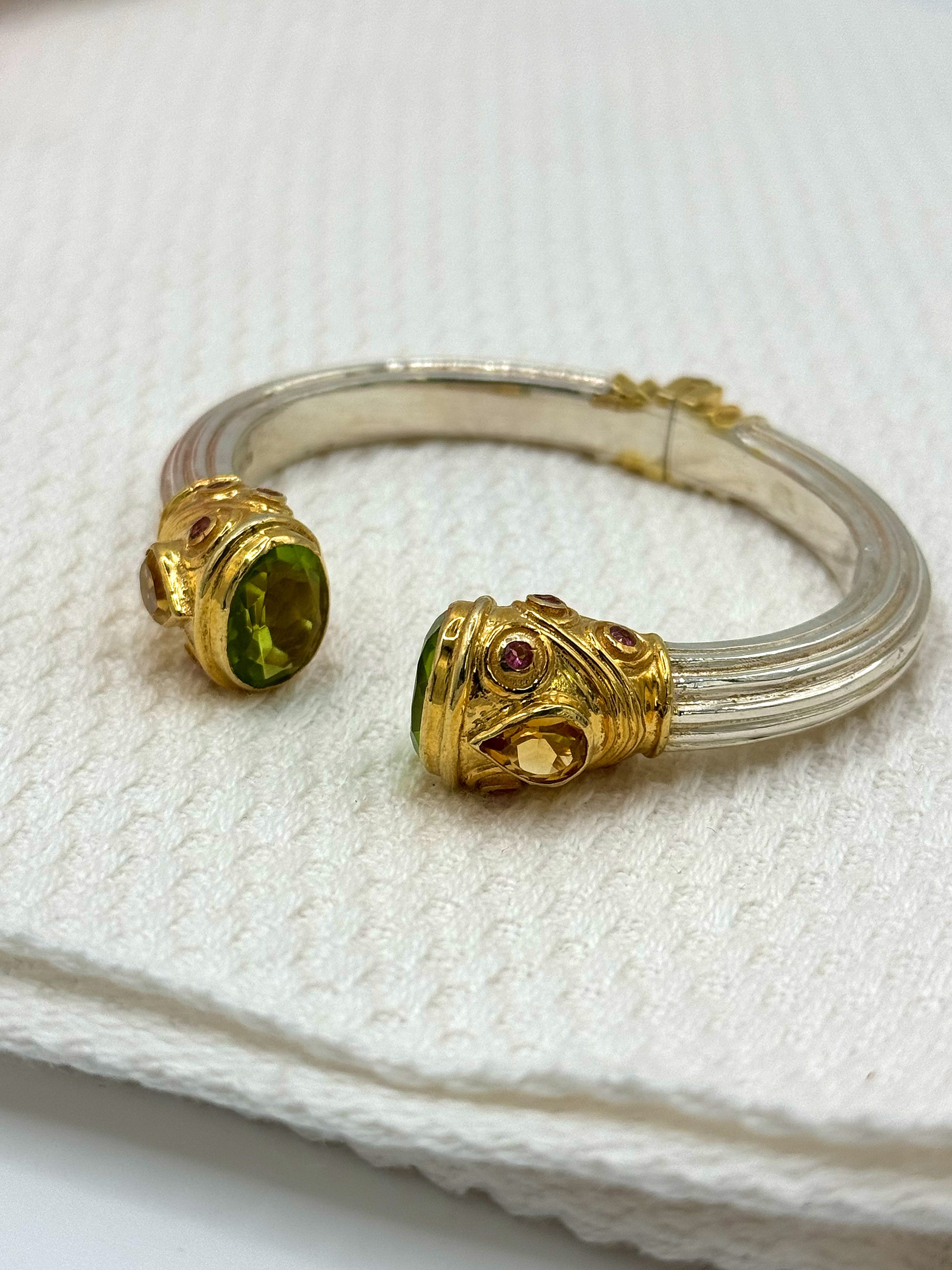 Silver & Gold Plated Peridot, Pink Topaz and Citrine Jewelled Bangle