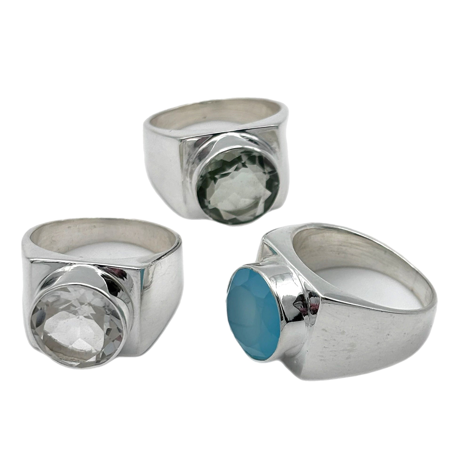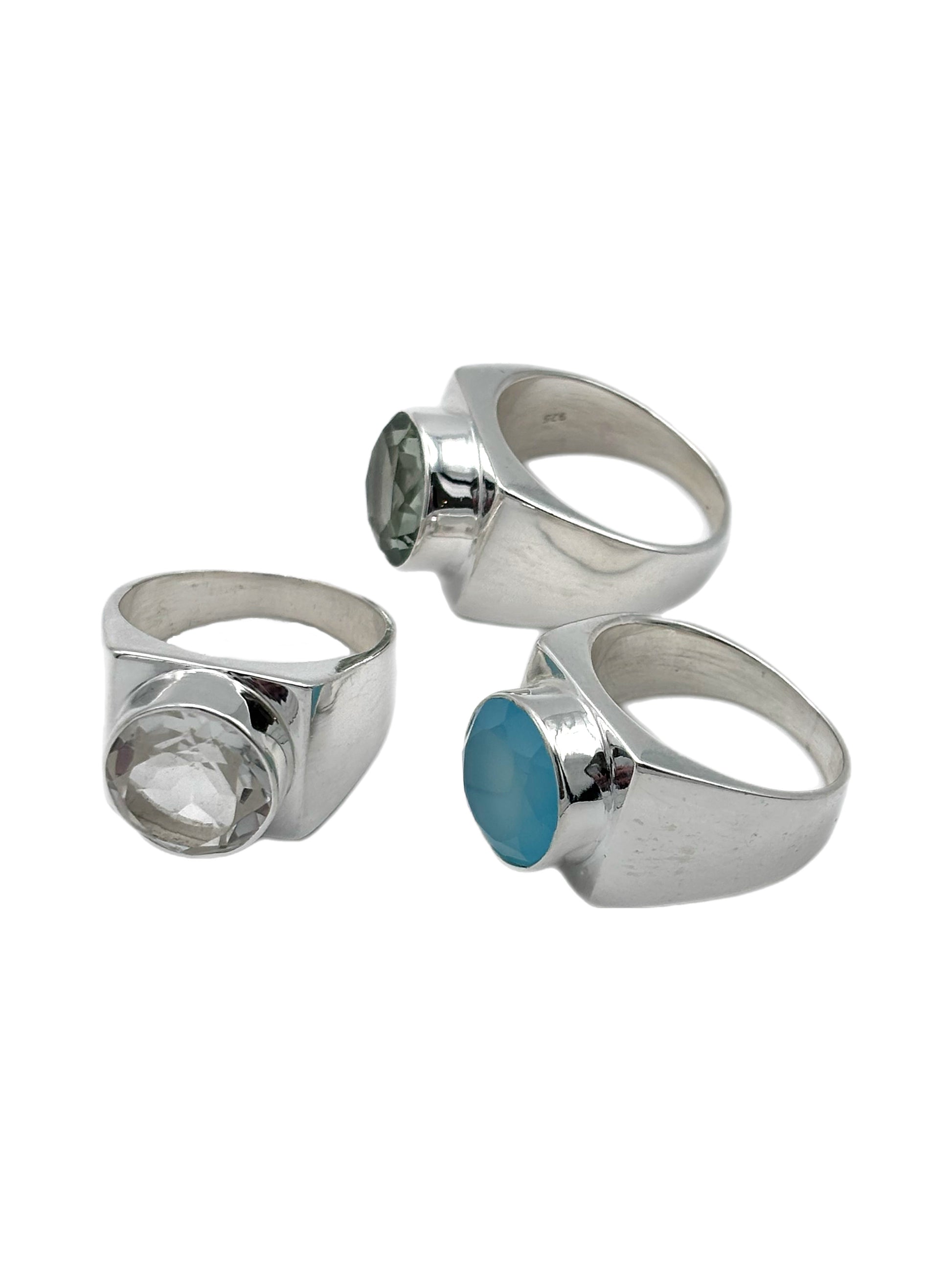 Available in 3 colours: Natural White Topaz, Green Topaz, and Blue Chalcedony.